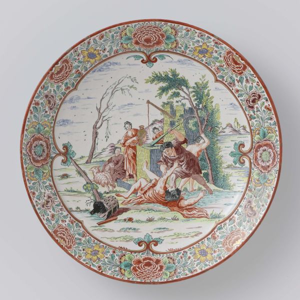 This saucer, likely made in Europe, features a mythological image based on the element fire, painted onto delicate porcelain. Porcelain itself is a fascinating material. Made from kaolin clay and fired at incredibly high temperatures, it vitrifies into a smooth, almost glass-like substance. The decoration is applied over the fired glaze, layer upon layer, each requiring separate firing. This painstaking process demanded skilled artisans, working within a highly structured workshop system. The scene depicted is fascinating, with its classical figures and allegorical elements. The painted decoration has a naïve, playful quality, a kind of misinterpretation of classical subject matter. The labor involved in the production of porcelain, from mining the clay to the final firing, often goes unnoticed when we focus solely on the image it carries. Considering the amount of work involved reminds us that even the most decorative objects are rooted in the realities of labor, trade, and the complex social dynamics of their time.