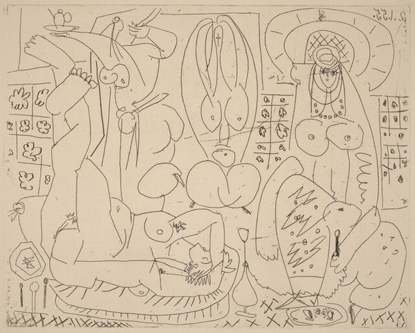 This is Pablo Picasso's "Variation on Delacroix's 'Women of Algiers': III," a print that invites us to consider the act of looking and representing. Picasso made this artwork in a very specific historical and cultural context. This was a time where artists were grappling with colonialism and Orientalism in art. In this variation, Picasso revisits Eugène Delacroix's painting, "Women of Algiers in their Apartment," made in 1834. Through his distinctive cubist lens, Picasso deconstructs and reimagines Delacroix's odalisques, challenging the traditional male gaze and its exoticization of women of color. What does it mean to rework the power dynamics inherent in such imagery? Consider how Picasso, a European male artist, engages with a scene set in Algiers, North Africa, and originally painted by another European male artist. The emotional complexity lies in Picasso's attempt to both honor and subvert the Orientalist tradition. This print reveals how cultural narratives are perpetuated, transformed, and contested through art.