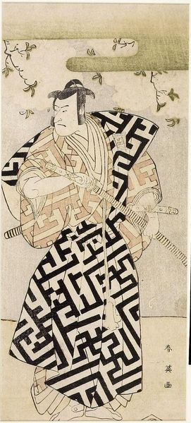 Curator: This woodblock print, attributed to Katsukawa Shun'ei, captures actor Sakata Hangorō II as a shittel. I am immediately struck by the expression of stern determination on his face, it seems at odds with the decorative robe. Editor: Indeed, the robe's swirling patterns contrast wonderfully with his rigid posture, doesn't it? It speaks to the performative aspect of Kabuki, and how identities are constructed and conveyed through such visuals. Notice the swords, both of which symbolize his status as a warrior and his theatrical profession. Curator: I agree that the clothing is a very intentional choice. It is intriguing how the symbols of the warrior class are appropriated here, and it makes you think about the social mobility of actors in the Edo period, and how they are perceived by the public. Editor: Precisely. And the composition itself—the careful balance of the actor's figure against the natural backdrop—elevates it beyond a mere portrait. It's a testament to the power of cultural performance and the enduring appeal of iconic imagery. Curator: A performance captured, a moment frozen in time. Editor: A vivid snapshot of Edo-era society.