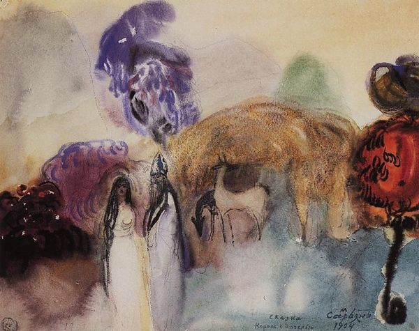 Martiros Sarian made this watercolor called Fairy tale. Garden of Eden. sometime in the early to mid 20th century. What I really notice first is the way Sarian uses color to create a dreamy, ethereal world. It's all about layering and blending, letting the colors bleed into each other. Look at the way he handles the trees. The trunks are solid, but the leaves are just suggestions, scribbled lines that hint at form. The paint is applied thinly, almost transparent in places, which gives the whole piece a sense of lightness. Notice the mark-making around the deer on the right, a mix of thin lines and washes that create a sense of depth. It's like the artist is inviting us to participate in the creation of this world. It reminds me a little of Odilon Redon, another artist who wasn't afraid to embrace ambiguity and let his imagination run wild. Ultimately, art is about opening up possibilities, not closing them down.
