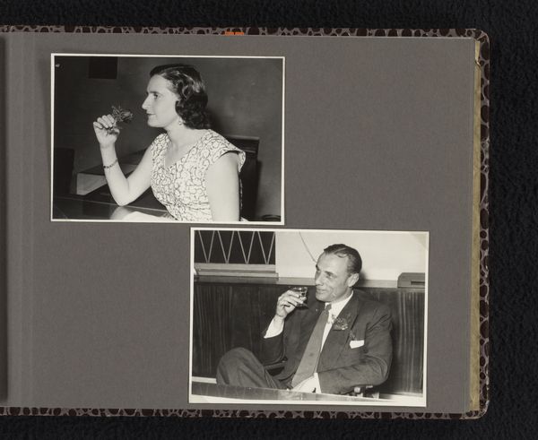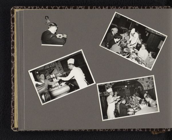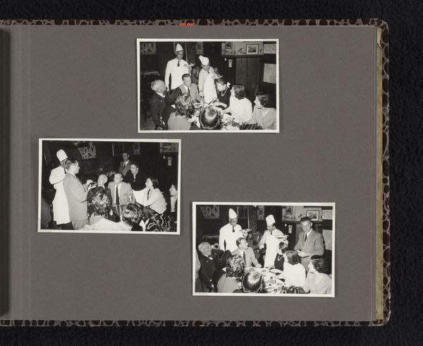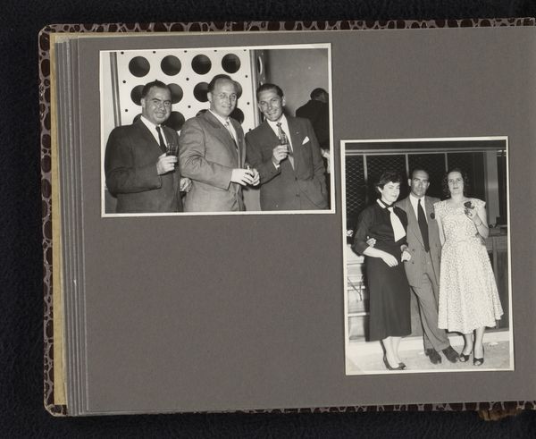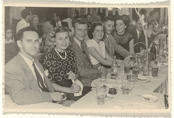 Editor: So this photograph, "Unknown colleagues of Isabel Wachenheimer during her time at KLM during a party and Isabel Wachenheimer," is a gelatin-silver print, placing it sometime between 1947 and 1955. It's a rather charming snapshot, but also feels quite staged. What's your read on a piece like this, particularly as a photograph seemingly capturing a candid moment within a larger, perhaps, institutional context? Curator: It’s interesting that you pick up on that staged quality. To me, these images speak to the carefully curated image of corporations like KLM in the post-war era. Note how everyone is dressed and behaving. How does this image contribute to the airline’s image and broader narrative that KLM was projecting at that time? Editor: That's a really insightful point, I hadn't considered the performative aspect of corporate culture in that era. I was focused on the 'party' element but framing it as part of KLM's public image definitely shifts the perception. Does the unknown nature of most of the subjects complicate interpreting the photographer's intentions or societal impact? Curator: Absolutely, but the very anonymity also reinforces the idea of collective identity within the corporation. This could be anybody in the KLM orbit, but it also shows that fitting in with the KLM social scene, by displaying signs of merriment such as toasting champagne or partaking in general chat, may very well have been key to promotion. These images offer clues of societal and company behavioural expectations, don't you think? Editor: Definitely! Considering it as a kind of 'company morale' visual, like corporate propaganda... I see it differently now! Curator: Indeed! It highlights how even casual photography served, and continues to serve, certain agendas and power dynamics within institutions. A slice of photojournalistic and public relations. Editor: That’s given me a completely new perspective on what might seem like an innocuous party snap. Thanks!