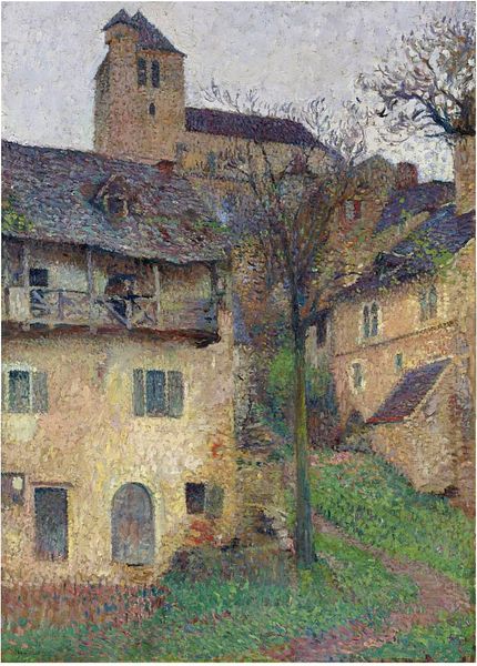 Henri Martin's "Houses in the Village" is a symphony of small brushstrokes, built from humble materials – oil paint on canvas – yet aspiring to capture the essence of a rural scene. Look closely, and you'll see how the materiality of paint is key. Martin builds up the surface through countless individual touches of color, an intensive, almost additive process. This technique, influenced by pointillism, isn't just about optical mixing; it's about the labor embedded in the making. Each dab represents a deliberate action, a commitment of time and effort. This emphasis on process resonates with the subject matter. The solid, vernacular architecture of the houses speaks to traditional building methods and a slower pace of life, contrasting with the mass production of urban centers. Martin elevates the ordinary through his meticulous application, bridging the gap between the industrial revolution and the timeless appeal of craft. The image invites us to reflect on the value of work, both artistic and practical.