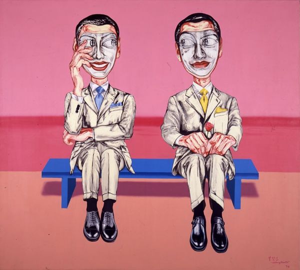 Zeng Fanzhi created this painting, part of his “Masks” series, to express the emotional and social complexities he observed in China's rapidly changing society. Born in 1964, Zeng experienced the transition from Maoist rule to a more market-oriented economy, a shift that deeply impacted individual identity and collective values. The figures, rendered in a hyperrealistic style, appear to be wearing masks, yet their eyes betray a sense of unease. The red ties symbolize the conformity expected in Chinese society, while the fleshy hands suggest a raw vulnerability beneath the surface. Zeng once said, "The mask is there to hide the real emotion." The use of masks can be interpreted as a commentary on the performance of identity, reflecting the pressures to conform to social norms while concealing one's true self. It speaks to a broader human experience, where the need for acceptance often clashes with the desire for authenticity. The artist draws us into an emotional landscape where the individual is caught between private feelings and public expectations.
