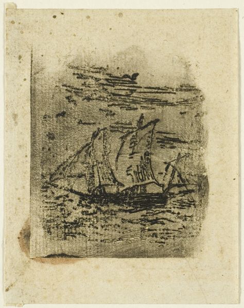 Curator: Before us, we have Hendrik Kobell’s “Seascape with Two Sailing Ships,” dating back to 1778. It's currently held at the Rijksmuseum. Editor: The first impression is of turbulence, a scene dominated by the choppy sea and heavy sky conveyed with a delicate, almost hesitant line. The balance achieved between such a stark composition and rendering such chaotic, churning form evokes Romantic sensibility. Curator: Precisely. Notice how Kobell utilizes a spare, almost skeletal linework. There's minimal shading. It's line defining form that creates a sense of depth. The stark, expressive power is in the starkness. We see here a clear manipulation of texture through hatching and the absence thereof, playing light against shadow in its most reduced form. Editor: The symbolic resonance is undeniable. The ship, throughout art history, signifies not just journey but also the human struggle against the immense power of nature, against fate itself. That tilting ship in the foreground becomes a symbol of vulnerability and resilience; the more distant one—hope, or perhaps escape. Curator: An apt reading. Kobell's conscious use of monochrome—achieved through a skilled economy of line—compels our attention, directing it across the dynamic, diagonally constructed seascape, allowing a narrative to emerge despite the lack of explicit colouristic cues. The work is as much about spatial relations as it is about anything representational. Editor: Beyond technique, there’s also the timeless theme, the human relationship to the sea: both a source of livelihood and constant danger. Seafaring nations projected national identity and the ocean symbolized their fears of nature, death, the unknown. Those vessels in particular are so vulnerable-looking as they’re depicted braving it all! Curator: Yes, and while the composition directs us outwards to the horizon, the formal constraint forces our eyes inward to dwell upon that central craft. The picture plane itself mirrors that confinement – that sense of predetermination. Editor: It leaves me pondering on that tension, the hope versus fragility it conveys. Curator: Indeed, a masterful demonstration of tension created through formal precision.