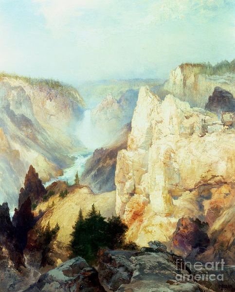 Thomas Moran painted “A Passing Shower in the Yellowstone Cañon” to capture the sublime beauty of the American West. Painted during a time of westward expansion, this work reflects a complex relationship between romanticizing the landscape and the displacement of Indigenous peoples. Moran, as a white artist, played a role in shaping the visual narrative of the West. His paintings, while breathtaking, often overlooked the presence and history of Native Americans, thereby contributing to a mythologized version of the land. The absence of Indigenous figures in the landscape subtly reinforces a narrative of 'untouched' wilderness, ready for settlers. The emotional impact of Moran's work is undeniable. The vastness of the canyon, the dramatic play of light, and the sense of awe it inspires can lead to reflection on our relationship to nature and the ethical implications of landscape representation. It invites us to consider whose stories are told and whose are left out in the visual record of history.