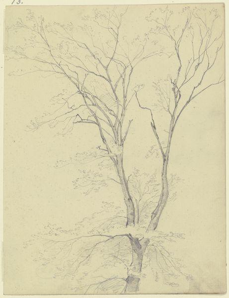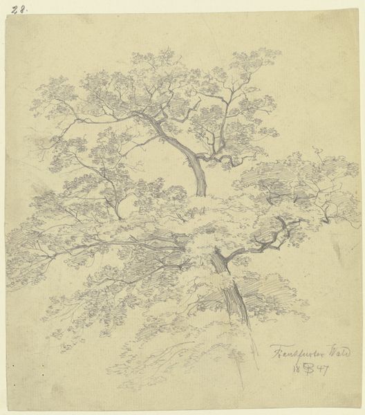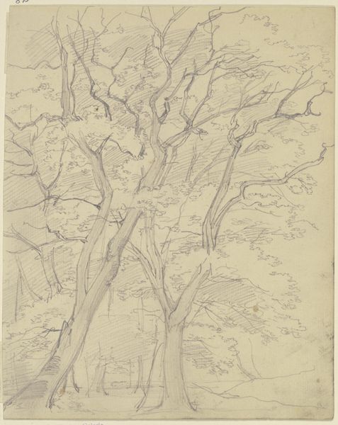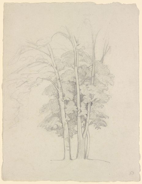 Editor: Welcome! Here we have “Laubwald,” or “Deciduous Forest,” a pencil drawing by Peter Becker, now at the Städel Museum. I find it so delicate; like a memory half-formed. What strikes you when you look at this? Curator: It whispers secrets, doesn't it? I see more than just trees. The gentle hatching gives life, like a breath on a cold pane. Tell me, do you get a sense of movement? Editor: I do, especially in the way the leaves are rendered – a soft rustle, maybe? How does that movement tie into its broader meaning, do you think? Curator: Well, movement often implies time, right? It could be the artist's own journey through the woods or a metaphor for life's fleeting moments. Do you notice how Becker focuses on light and shadow, and how that might relate to seeing and feeling? Editor: I do. It's almost like the light is shaping the scene, drawing attention to specific areas while obscuring others. That makes it feel less like a literal representation and more about the experience. It makes me think about the ephemeral nature of forests. Curator: Precisely. The experience, the feeling—it transcends the simple landscape. Becker uses that to evoke a mood of quiet introspection. Editor: So, beyond just depicting a forest, Becker’s really inviting us to consider the emotions and the sensations of being there. Curator: Yes! It becomes a self-portrait of the soul in nature. It makes you wonder about our place in all of this, doesn’t it? Thanks for pointing all of that out to me.
