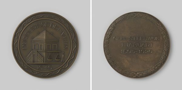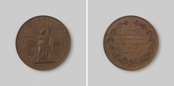 This commemorative medal was made by Adolphe Jouvenel to celebrate the fiftieth anniversary of the "Les Vrais Amis de l'Union" masonic lodge. Struck from bronze, the medal’s design on both faces is achieved through the precise application of pressure. Bronze, a durable alloy of copper and tin, allowed for the crisp reproduction of intricate details, such as the architectural facade and inscriptions commemorating lodge members. Medals like these would have been produced through repetitive processes in a workshop setting, hinting at the organization and labor involved in their creation. The choice of bronze also suggests an intention for longevity. These medals are made to be kept and passed down. The appeal is not just aesthetic but also historical, a reminder of the significance of the lodge and its members. It’s a beautiful example of how material choices are integral to the medal’s commemorative function.