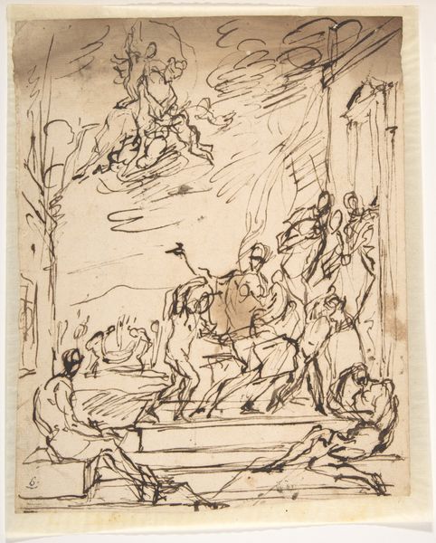 Editor: Okay, next up is "Krosfæstet røver, ryttere ved korsets fod"—which roughly translates to "Crucified thief, riders at the foot of the cross"—a pen and ink drawing by Jürgen Ovens. It's quite striking. It's loose and sketchy but manages to convey a real sense of drama and… movement? What are your thoughts? Curator: It vibrates, doesn’t it? As if caught mid-thought or mid-act. The artist, Ovens, isn't giving us a polished scene, but rather an explosion of emotion. Notice the confident, almost frantic lines. They remind me of someone sketching furiously to capture a fleeting vision or the raw energy of a moment before it dissipates into memory. Editor: Yes, frantic is the right word! There’s a kind of controlled chaos in the strokes. I'm also curious about the composition - the riders seem almost secondary to the figure on the cross, yet they're physically 'grounded'. Curator: Precisely. The baroque loved the spectacle, the theatre of faith and power. Ovens is turning that spectacle inward. He's asking us to consider not just the event – a crucifixion – but the raw, psychological response to it. Do those riders look particularly pious to you? Are they figures of awe or perhaps indifference? Editor: I see what you mean, they seem strangely detached! Is it just me, or does Ovens hint at some uncomfortable truths? Curator: Art isn’t meant to just soothe or instruct. Sometimes it’s a goad. He's provoking us into grappling with the discomfort inherent in this kind of stark image. It doesn’t sit neatly, does it? It’s a raw, incomplete thing - much like life, I find. Editor: Definitely makes you look at things in a new light. I appreciate seeing the historical themes, and emotional response juxtaposed!