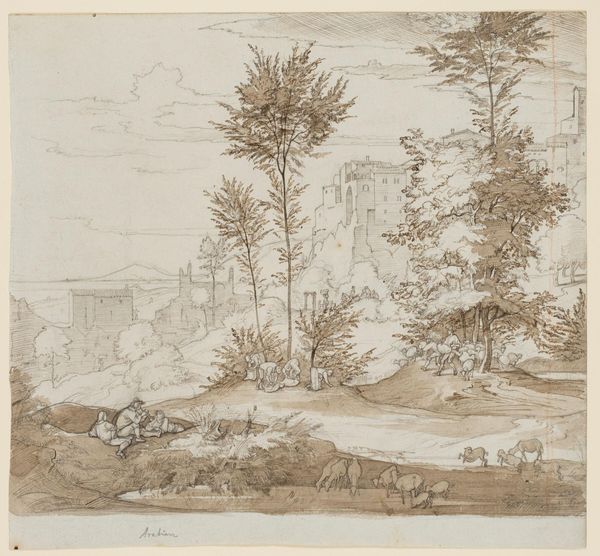 Curator: Looking at Franz Kobell's "Figures in Idyllic Italianate Landscape," it strikes me how delicately the pen, ink, chalk and watercolor bring this scene to life. What is your first take? Editor: It’s definitely giving me vibes of leisurely labor! Look at these figures down by the water – washing clothes or maybe even catching fish? It really draws my eye to the connection between people and their environment. Curator: Exactly, it’s this idealized vision of rustic life within this meticulously crafted landscape that pulls you in. We see touches of Romanticism through his choice of imagery—an Italian countryside and its people coexisting in perfect harmony with nature, it hints at something ancient, doesn't it? Editor: Absolutely. I think Kobell does a fascinating job here in showcasing how art materials become powerful storytellers themselves. Look at the way the paper becomes a stage of sorts, reflecting labor. The tools determine the impact, I suppose. It is Romanticism at play with the physical conditions of the work. Curator: And notice that the materiality pushes beyond mere illustration, and actually communicates the kind of atmosphere that encourages one to muse about the connection with history and land. The artist makes you think, yes? It captures a feeling of Arcadia, lost perhaps but still shimmering in memory. It is interesting to note the relationship between figures depicted and their activities. Editor: It also reminds me to examine these social relations a bit closer and think about how access to the best quality materials impacted Kobell's approach to subject matter here! How were the watercolors sourced? How does this availability influence the perception? Curator: That’s a wonderful point, because the choice of ink and the technique give an ephemeral feeling; which could be also associated with fleeting memories. What we are viewing then isn't only a representation but rather the tangible form of memory itself, evoked by Kobell’s technique and Romantic ideal. Editor: Ultimately, examining the artist's decision-making with his selection and process, including using linocut print, brings me closer to an awareness about class and consumption within the idyllic scenes depicted! Thanks for opening my mind to see those memories! Curator: Likewise. Thinking about the physical qualities enhances this glimpse into memory, even of things one has never personally known.