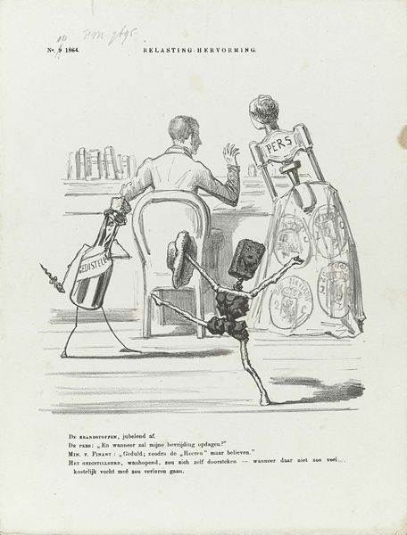Johan Michaël Schmidt Crans created this print of Minister Cremers in 1865. The cartoon depicts a precarious balance of European powers, reflecting the tense political climate of the mid-19th century. The imagery employs a weighing scale, with the "Duitsche Bond" or German Confederation on one side, weighed against "Frankrijk" or France and "Engeland" or England on the other. This setup symbolizes the delicate equilibrium between these nations, which were vying for dominance. Two figures stand beside the scale, seemingly attempting to influence the balance, embodying the political maneuvering of the time. The print’s caption suggests Minister Cremers' actions regarding Limburg were upsetting the balance of Europe. Consider how this commentary speaks to the perceived fragility of peace and the ever-present threat of conflict. It's a stark reminder of how regional decisions could reverberate across the continent, influencing international relations and power dynamics.