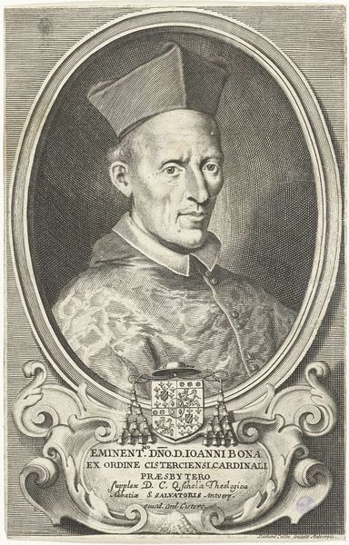 This is Gaspar François Edelinck's "Portret van Francisco Jiménez de Cisneros," made using engraving. Edelinck was a Flemish-born French engraver, working in a time when art was deeply intertwined with politics and religion. Here, we see Cardinal Francisco Jiménez de Cisneros, a figure of immense power in Spanish history, known for his role as a Grand Inquisitor. The print not only commemorates his status but also reflects the complex dynamics of power, faith, and identity. Consider how the image of Cisneros, framed within ornate borders, reinforces his authority. How does it feel to confront an image of someone who wielded such influence during a period marked by religious persecution? Edelinck invites us to reflect on the legacies of those who shaped history.