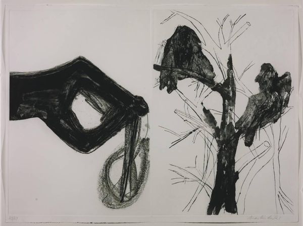 Editor: This untitled lithograph by Martin Disler features stark black shapes on a white background. The bold forms feel almost aggressive. What can you tell me about it? Curator: Considering Disler's practice, I see a focus on the lithographic process itself. The stark contrast highlights the physical act of applying ink to stone. We see the artist's labor in the deliberate marks and the interplay between positive and negative space. It's a challenge to traditional painting, isn't it? Editor: I see that. It's less about representation and more about the physicality of creating the image. Thank you! Curator: Precisely. And this highlights the means of production and making of art. The process is very important here.
