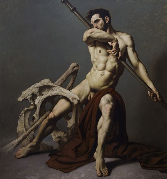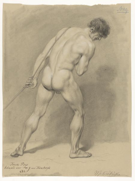 Curator: I'm immediately drawn to the chiaroscuro in this piece. There's such dramatic play between light and shadow, highlighting the figure's muscularity. Editor: Indeed. What we're looking at is titled "Study of a Nude Man" by Pierre-Narcisse Guérin, likely executed between 1810 and 1820. It’s oil on canvas. Guérin, a significant figure in French Neoclassicism, straddled the line between the classical ideals and emerging Romantic sensibilities. Curator: It's interesting you mention that tension. While the pose is very reminiscent of classical sculpture—we see that contrapposto stance—there’s also a rawness in the depiction. The face is shadowed, almost melancholic. There's a vulnerable aspect that veers away from idealized perfection. Editor: Absolutely. Consider the historical context. The rise of Napoleon, the shifting power dynamics. The male nude, historically a symbol of strength and civic virtue, begins to reflect perhaps a questioning of those established narratives. This isn’t just a celebration of form; there’s almost a subtle commentary on the burden of masculinity and power. The subject looks as if he were leaning into the tool to brace himself. Curator: I see that. The tool the figure is clutching takes on added meaning beyond that of just a farm tool. It brings to mind images of the Roman soldier grasping his gladius, or some type of other military motif. Is Guerin alluding to something deeper, perhaps the inherent violence required to maintain order, and thus, authority? Editor: It’s compelling to consider it within a psychological framework too. Notice the dark background, how the light barely reaches his face, almost suggesting internal conflict. There’s something very timeless about the image, capturing the essence of human strength and vulnerability intertwined. It reflects, in its very form, how complex a man's place is during political upheaval. Curator: It does encourage such reflections on social, personal, and art historical connections, doesn’t it? Editor: It certainly does, which ultimately makes the piece very valuable. It gives you space to analyze these thoughts and themes.