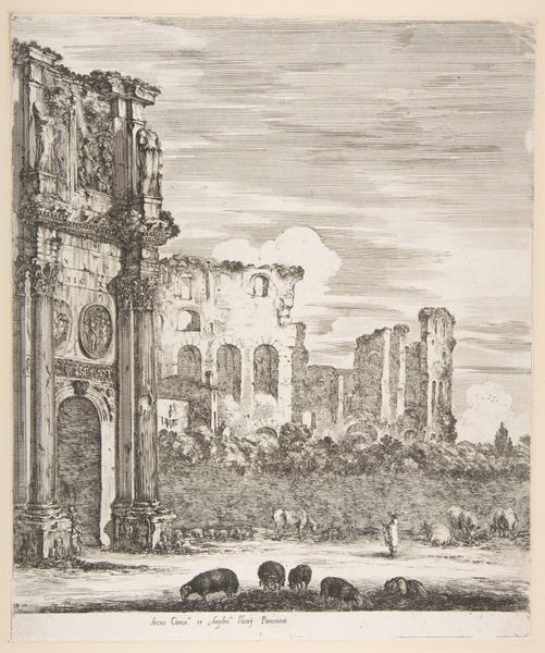 Canaletto created this etching, ‘The House with the Peristyle,’ to be included in his series ‘Vedute.’ The composition, rendered in stark monochrome, immediately suggests a scene of architectural decay and transformation. A grand structure is presented in a state of visible disrepair; even the sky presses down with its densely etched clouds. Canaletto employs etching lines to describe gradations of light, shadow, and texture. This use of line emphasizes the materiality of the buildings, making the stones appear almost tactile. The contrast between the solid architectural forms and the fluid, watery environment reflects Venice's unique relationship with nature and its constant negotiation between permanence and transience. Notice how the sharp details in the foreground contrast with the softer lines in the distance, drawing our eye through the space. These techniques not only demonstrate Canaletto's mastery of the etching medium but also invite us to consider the interplay between ruin and beauty, structure and surface within the evolving urban landscape of Venice.