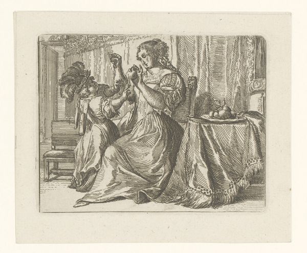 This etching by Romain Looymans depicts a woman engaged in handwork in an interior, rendered with fine lines. The scene includes an interior space adorned with what appears to be a folding screen featuring herons, flowers and foliage. The presence of herons on the screen behind the woman brings forth a deep echo of avian symbolism, which is rich across cultures. In ancient Egypt, the heron was associated with rebirth and the rising sun. In China and Japan, it represents longevity and wisdom. Notice how this bird, often linked to vigilance and patience, enhances the domestic scene with a sense of timeless watchfulness, adding an emotional layer to the woman’s quiet industry. Consider the psychological weight of such symbols. The folding screen does not simply decorate the space; it infuses it with layers of cultural memory, subtly affecting the emotional and intellectual context of the scene. The cyclical and non-linear progression of these symbols highlights their enduring resonance and adaptive capacity across different historical moments, enriching our understanding of how images function as carriers of cultural meaning.