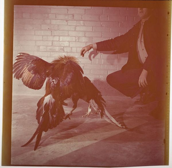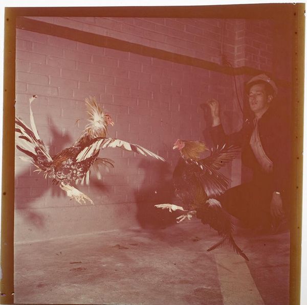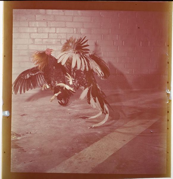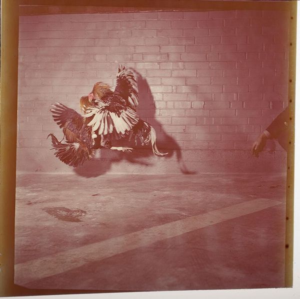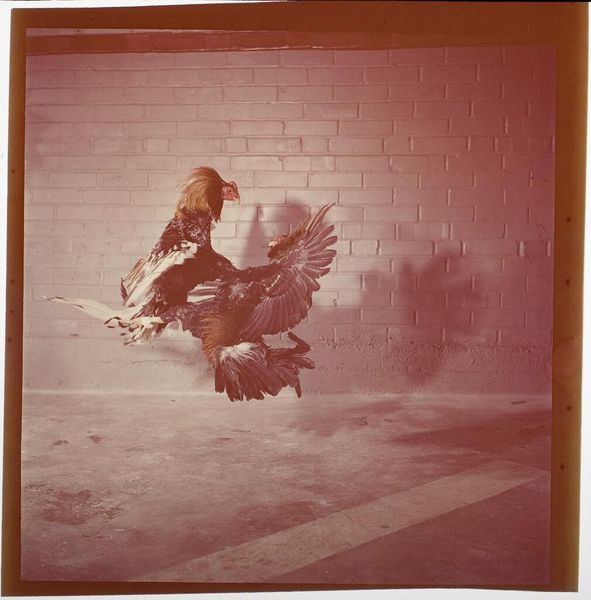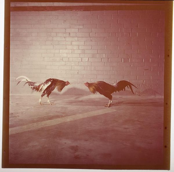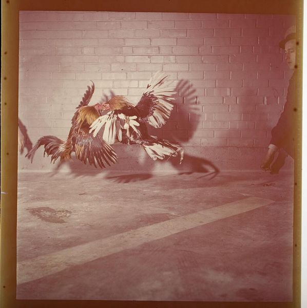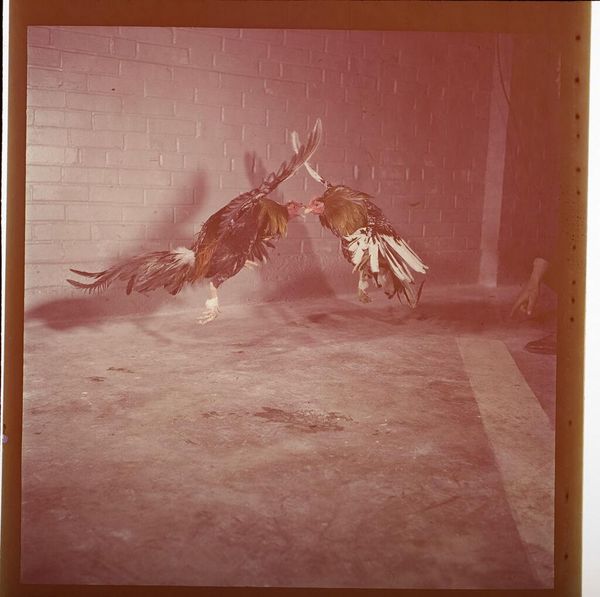 Curator: This photograph, by Jack Gould, is titled "Untitled (two birds cockfighting)." Its date is unknown. It's a chromogenic color print, quite small, only 6 by 25 centimeters. Editor: It’s stark. The harsh light, the concrete floor... it feels clandestine, violent, but with a strange detachment. Curator: Cockfighting has a long and complex history across cultures, often associated with masculinity, gambling, and rural traditions. Editor: Right, and the image can be viewed through the lens of animal rights and ethical concerns, raising questions about exploitation and cruelty normalized for entertainment. Who benefits, and at what cost? Curator: Precisely. Gould's photograph documents a practice that exists outside mainstream society. Editor: Looking at the picture, its casual voyeurism leaves me conflicted. It’s brutal, but also a glimpse into a subculture often hidden from view. Curator: It invites us to confront uncomfortable truths about human nature and our relationship to animals. Editor: Absolutely. It challenges viewers to question their own complicity in systems of power and exploitation.