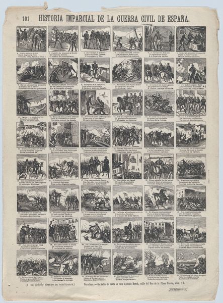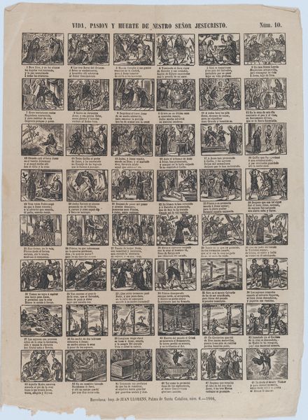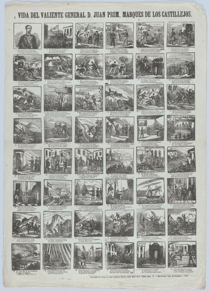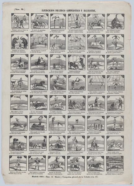 Curator: This fascinating broadside, titled "Broadside with 48 scenes depicting the equestrian and gymnastic moves of the royal circus," was created in 1860 by Juan Llorens in Barcelona. It is an engraving printed on paper, essentially a poster advertising a circus. Editor: What immediately strikes me is the almost comic-strip like arrangement of the 48 small scenes. There's a wonderful sense of movement captured in these static images; each miniature composition, though simple, feels so dynamic. Curator: It’s a visual feast! The repetitive grid structure gives the impression of both documentation and promotion, very typical for commercial prints during that era. The circus, then as now, was a significant form of public entertainment, and posters like this played a crucial role in attracting audiences. We can assume that this object represents the popularity of equestrian shows among the middle and upper classes. Editor: Agreed. What interests me compositionally is the clever way Llorens suggests depth and volume using minimal lines and cross-hatching. The figures are stylized, but their poses are so effective in conveying balance, force, and skill. I think this adds significantly to the appeal. Curator: I agree. Llorens's work here reflects broader trends in popular culture at the time; circuses acted as communal places and reflected evolving ideas about entertainment. These scenes offer insight into the spectacle of circus life and its reception among the public in mid-19th-century Barcelona. Editor: From a purely visual standpoint, this piece is just delightful! Curator: Indeed. And what a valuable artifact this work is: we can glean many things about culture through the material object. Editor: Ultimately it provides an intimate look into an era gone by and the entertainment culture of the era.