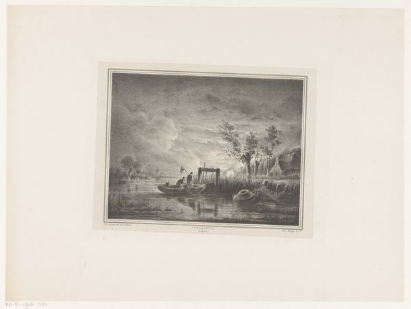 Curator: Let's turn our attention to this delicate drawing by Jacobus Sörensen, "River View with House and Herdsmen with Cattle." The Rijksmuseum dates it sometime between 1843 and 1856. Editor: A landscape bathed in a melancholic quietude. It's predominantly monochrome, but within that limited palette, the artist captures so much detail... It's oddly soothing. Curator: Note how Sörensen articulates the landscape—the texture of the trees, the flow of the river, even the atmospheric perspective created by the layering of forms, subtly reducing detail with distance. He masterfully employs hatching and stippling techniques. Editor: The figures—almost swallowed by the scenery! These shepherds seem like mere afterthoughts... almost symbolic. Perhaps representing mankind's humble position within the broader scheme? Or is it simply capturing a nostalgic, idyllic moment? Curator: Indeed, the figures serve a crucial function in defining the scale, rooting us within the represented space. Consider, too, the linear framework provided by the river, cutting through the composition and guiding the viewer’s eye towards the distant horizon. Editor: It almost feels as if the river is breathing. The subtle gradations give a soft and organic life to the work, I’d say, like memories, or emotions fading gradually. But that building, though... What's your read? Isolated? Secure? I am curious to know how you analyze the effect that building brings to the artwork Curator: Interesting question! If we break down its location and structural features... The placement near the river implies both dependence and potential vulnerability, with the darker accents in its composition bringing about an eerie or more secretive nature. The structure contributes a vital architectural element, setting it in sharp counterpoint against the natural landscape, thereby engaging tensions with the wild and managed. Editor: Hmmm...Well I get from that contrast almost like two different dreams weaving together. And this, in my perspective at least, makes this a good piece. Thanks for unpacking this landscape, it shifted something inside. Curator: Indeed. Delving into these works helps reveal not just what we see, but also how we learn to truly *look.* Thank you for the dialogue, Editor.