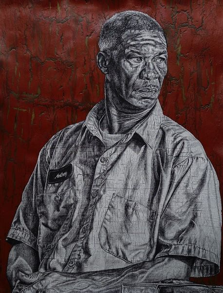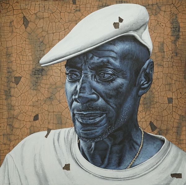 Alfred Conteh’s portrait is a powerful exploration of identity, rendered with striking blue hues against a shimmering gold backdrop. The subject’s gaze, directed slightly upward, evokes a sense of hope, of seeking something beyond. Consider the color blue, often associated with melancholy yet also with transcendence, as seen in Renaissance depictions of the Virgin Mary. Here, the cascading lines create a sense of vulnerability, akin to tears or rain, washing over the figure. Gold, traditionally a symbol of divinity and enlightenment, contrasts with this emotional outpouring, perhaps suggesting a divine presence amidst struggle. The portrait embodies a complex interplay between pain and aspiration. The image speaks to the cyclical nature of human experience, of how suffering and hope, despair and faith, continuously resurface, evolve, and find new meanings across time. The use of color and line, combined with the subject's expression, invites us to contemplate the depths of the human spirit.