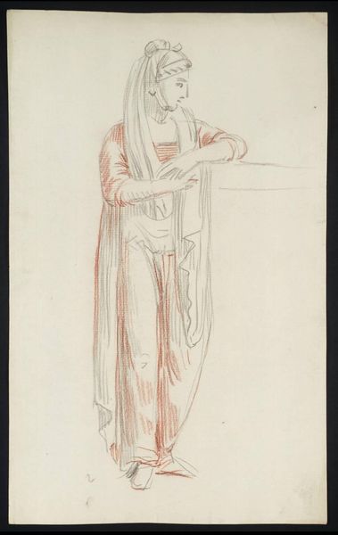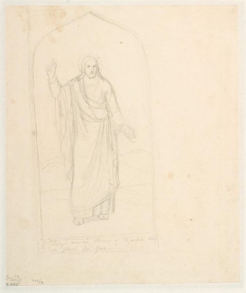 Curator: Here we have a drawing entitled “Saint Barbara.” It's a pencil work on paper currently held in the Städel Museum's collection. Editor: My first thought is one of intimacy; there is a kind of soft vulnerability to it, given its status as a preliminary sketch. Curator: Indeed, Barbara, forever linked with her tower, looks almost melancholic. The architectural symbol, though solid in form, adds a dimension of captivity, while in this image other sketches of faces and rosette embellishments on the dress imply layers of cultural understanding and transmission. It isn't merely decoration. Editor: Speaking of the dress, you can see where the artist made and then revised the folds, how they were thinking through gravity and volume as they went. Was this process about defining an ideal, a cultural concept? Curator: Exactly. Barbara is not merely a person; she embodies a network of theological and societal beliefs. The tower represents her imprisonment and ultimately, her steadfast faith. Even the choice of pencil on paper – simple, easily transportable – hints at dissemination of knowledge, reaching broader audiences perhaps. Editor: I hadn’t considered that link between materials and the artwork’s purpose. Were these sketches used as templates, disseminated in workshops perhaps? Reproducible images could solidify Barbara’s attributes for easier recognition. Curator: Precisely! The multiple versions of Barbara's head suggest attempts to find the most recognizable form. The dress details become visual cues for instant cultural recognition. It all speaks to how knowledge, devotion, and, indeed, power were meticulously produced and consumed. Editor: Examining this as a workshop product allows us to grasp the artist's process while emphasizing the social aspects, which for me gives this “Saint Barbara” new value beyond her traditional symbology. Curator: I agree, seeing the emotional core embedded into symbols – makes our experience far richer.