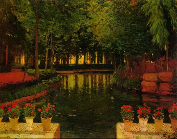 Curator: Here we have Nikolay Bogdanov-Belsky’s "Lake and Gardens with Statuary Landscape," a striking oil painting rendered en plein air. It certainly has that impressionistic flair. Editor: What a dream. The kind of place where you might meet a water sprite or find a hidden doorway, all softened by memory and hazy sunlight. Curator: Exactly, it’s that pursuit of capturing fleeting light and atmosphere. Let's consider the application of paint here. See the textured brushstrokes and vibrant hues – a hallmark of plein air. It makes you wonder about Bogdanov-Belsky's specific experience creating it. Editor: Yes, I wonder about his breath, you know? It is very evocative—makes me think he found himself a peaceful refuge in a sometimes chaotic time. I’m feeling the urge to just reach into that bench with some friend of mine and, I do not know, laugh a bit at the beauty. Curator: The romantic undertones are difficult to miss—there's certainly an interplay between civilization and nature occurring here, in which the natural elements, like trees and the flowers, merge gracefully with constructed elements like the statue. The garden is made more appealing because it presents signs of wealth through ornamentation, sculptures, and design. Editor: I imagine the painting embodies the idea of nature perfected by humans. I believe this painting would allow you to feel, at least temporarily, untouchable—immersed into an untouchable world. A memory forever living and protected in my head. I just hope that bench is comfy. Curator: I'd argue that through its visual composition and painterly qualities, Bogdanov-Belsky gives material form to a specific vision, reflecting and shaping how society views these gardens. It seems there's more here than a casual appreciation for nature's beauty. Editor: For me, it goes far beyond that… beyond technique. There is some kind of truth in that artificial pond where one can breathe peacefully... In short, it calls for peace, even from afar.