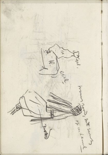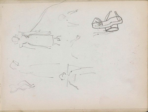Editor: Here we have George Hendrik Breitner's "Studieblad," created between 1884 and 1886, housed at the Rijksmuseum. It's a graphite and pencil drawing, a study really, and I'm struck by its fragmentary nature, like a fleeting thought captured on paper. What do you see in this piece? Curator: I find myself drawn to the dynamic interplay between the visible and the implied. Note the stark contrast between the assertive lines that define the figure’s arm and the almost ethereal quality of the torso and legs. Breitner masterfully employs varying densities of graphite to create a sense of depth, despite the absence of conventional shading. Editor: So you are focused on the structural and compositional elements within the drawing itself? Curator: Precisely. Observe, too, the strategic use of empty space. The vast expanse of untouched paper serves not merely as a backdrop, but as an integral element of the composition, amplifying the sense of isolation and incompleteness inherent in a study. This reminds us that what is *not* depicted can be just as important as what *is*. Editor: That's fascinating. I hadn't considered the negative space as being such an active component. I tend to see the roughness of the sketch as merely preparatory. Curator: Consider the pencil marks themselves. They are not merely representational tools, but tactile, almost sculptural elements in their own right. The varying pressures and angles speak to the artist’s physical engagement with the medium, offering insight into the artistic process itself. Editor: I see what you mean. So much can be gleaned from the most fundamental elements – line, space, and material. Curator: Indeed. Breitner uses these elements to engage the viewer and prompt further investigation into their aesthetic significance, transcending the constraints of mere subject matter. Editor: I will never look at a sketch the same way. Thanks for shedding light on the details!