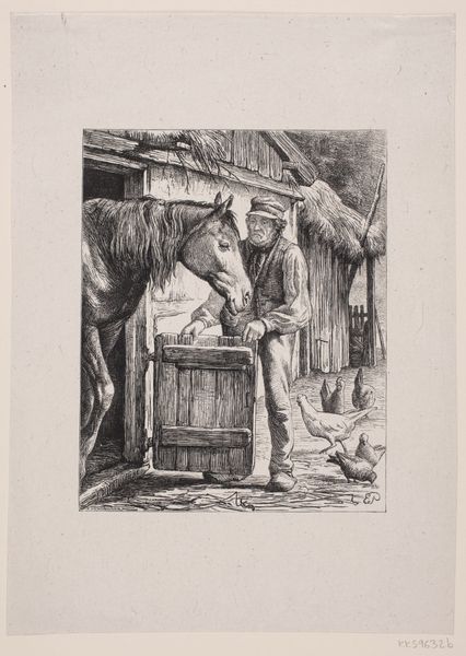 Curator: Robert Frederick Blum created this piece, called "Pestling the Paddy," sometime during his career; a study in charcoal, chalk, pencil, and ink. The subject depicts a milling scene. Editor: The first thing that hits me is the light—it's a bit melancholic. It has this hazy feel like it’s remembering a scene, rather than just recording it. Does that make sense? Curator: Absolutely. Looking at how the charcoal outlines the figures and the mill itself, you get a sense of movement and a fleeting moment captured. The blending of the chalk softens the harshness. Editor: I love that phrase: fleeting moment. It's the posture of the workers, right? One leaning on the lever of the mill, the other sweeping the ground… Curator: Precisely! And, from a formalist standpoint, the use of the limited tonal range focuses the viewer on the geometry within the composition. The interplay of the human figures and the structural elements becomes more pronounced. Editor: It makes me think about labor, you know? How much time and effort is condensed into something as simple as a bowl of rice. I guess it's something people from other places often forgot. And something about Blum's mark making hints at the grit. Curator: The composition's organization reflects Ukiyo-e influences, flattening the picture plane, emphasizing silhouette, and compressing depth—similar to the Japanese prints that were popular in the late 19th century. Editor: There is almost like a painterly effect with those gray values; it’s amazing for charcoal! It goes beyond capturing just the shapes and shadows—it's an evocation. Blum used a Western medium to approach Eastern subjects in a more modern view. Curator: The work allows us to observe how different cultural elements are interpreted and transformed through an artist’s individual lens. Editor: Looking closer, it's clear there's more to "Pestling the Paddy" than just an image of milling grain; it’s a quiet contemplation of what connects us as humans.