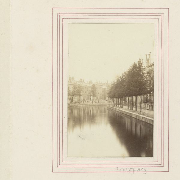 Editor: Here we have "Vijver in Den Haag," a photographic print by Andries Jager from around 1870, currently at the Rijksmuseum. It depicts a tranquil pond scene. The reflections in the water are quite striking; the still water mirrors the trees creating a beautiful symmetry. What do you see when you look at this piece? Curator: Indeed. It is quite fascinating how the artist has captured the light and form. The photograph excels as an early example of pictorialism, and one can truly appreciate its tonal range. The composition is quite stable; a horizontally oriented image creates a mirror image between land and water. It shows a conscious use of balance, but it can be read critically using semiotics to think about the idea of mimesis. Editor: Semiotics in this context? Could you elaborate on that? Curator: Certainly. Semiotics allows us to explore the layers of meaning embedded within the photograph. While seemingly a straightforward depiction of nature, the careful composition, the choice of light, and the manipulation of tones—characteristic of pictorialism—transform the scene. Is this image merely a window to a pre-existing reality or has its intrinsic artistic properties created the pond and the forest anew? Editor: That’s a perspective I hadn't considered! It really emphasizes how the photographer isn’t just recording but also creating a version of reality. This analysis enriches my viewing experience. Curator: Exactly. By examining these elements, we come to an understanding that is deeper than just 'seeing', allowing for new conceptualization.