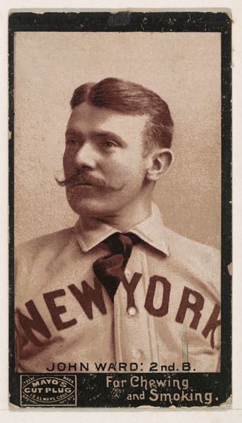 Curator: Here we have “$10,000” Kelly, Boston, from the Old Judge series, produced by Goodwin & Company between 1887 and 1890. This striking image is a print. Editor: I must say, the sepia tones give it such a melancholic yet powerful presence. The crisp focus on his face, framed by that now-aged paper…it's remarkably evocative. Curator: Absolutely. Consider the context: baseball in the late 19th century was rapidly professionalizing. "King" Kelly, as he was known, was one of its first true superstars, and was Irish-Catholic—his ethnicity would have been noticeable given the discrimination faced in professional spaces, adding an interesting dimension to his appeal and that incredibly high price tag of $10,000. Editor: I find it compelling how the "Old Judge Cigarettes" banner at the top integrates the consumerist function of this card without overwhelming the central subject. The stark lettering of “BOSTON” bisected by lace evokes the iconic American jersey while simultaneously suggesting a constrained energy, almost caged within the frame. Curator: It reflects the commodification of athletes and celebrity that was just emerging. This wasn't simply a picture of a player; it was part of a marketing strategy intertwined with ideas of fame, labor, and even ethnic identity, packaged into something consumable. We must also remember baseball was closely aligned with ideas of masculine Americana. Editor: And even in the framing, the composition isolates Kelly, emphasizing not only his fame but hinting at his market value to that historical moment. A commodity elevated through aesthetics! The slightly blurred quality of the background seems intentional, amplifying the power projected by the player himself. Curator: Precisely, a visual articulation of economic power and the construction of the athlete as a valuable symbol, which then ties into contemporary discourse around player exploitation, racial justice, or labor disputes in sports, and speaks to continued exploitation within those power structures. Editor: Fascinating how a simple baseball card unveils layers of symbolism. The composition's simplicity focuses my thoughts back to how an everyday object can transmit deeply rooted sentiments about value, labor, and identity through form itself.