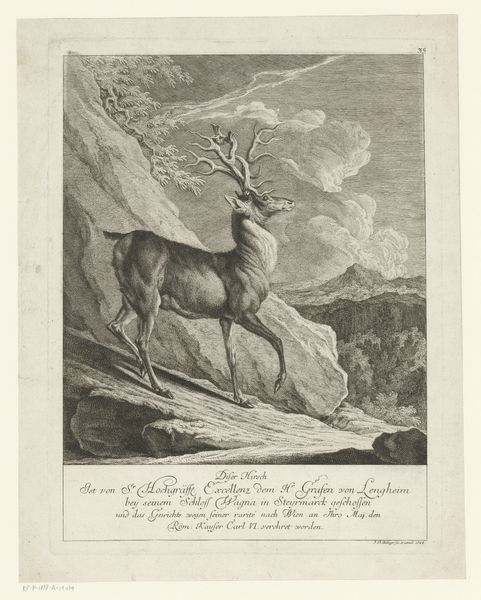 Editor: So, this is "Zeer groot hert," or "Very large deer," an engraving by Johann Elias Ridinger, created sometime between 1740 and 1767. It's strikingly serene, almost stately, the deer framed against this dramatic landscape. What resonates with you when you look at this piece? Curator: The stag is a recurring symbol, isn’t it? We find it in cave paintings, medieval tapestries, and here, in a baroque print. Its antlers are particularly evocative, carrying echoes of power, nobility, but also vulnerability, the shedding and regrowth representing cycles of life. Do you notice how the landscape both supports and perhaps confines the creature? Editor: I hadn't thought about the landscape that way, but I see what you mean. It's both a backdrop and kind of a...cage almost. What does that tell us about the relationship between humans and nature during the baroque period? Curator: Well, hunting was certainly a royal sport, signifying dominance over nature, so consider what the imagery suggests about human power in contrast to the raw animal presence. Is it possible Ridinger used it to evoke cultural memory in his patrons, reaffirming class and position? How do you read the tension in the print? Editor: That's a great point about hunting. The print almost feels like a trophy, in a way, celebrating the hunt, but it also kind of mourns the animal's captivity in the composition. Curator: Precisely. These contrasting symbols—freedom, capture, power, sacrifice—reflect enduring human tensions when facing the natural world. Considering this further enriches the meaning and weight the image carried, and still does, don’t you think? Editor: I agree. Looking at the stag not just as an animal, but as a cluster of symbols—it unlocks so many interpretations about cultural memory and its meaning. I would never have picked up on that. Curator: Art encourages this sort of interpretation!