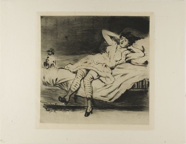 Editor: We're looking at Honoré Daumier’s lithograph from 1847, "A zealous student practicing at home." The title intrigues me, because at first glance it appears like an intimate scene abruptly interrupted. How do you read the composition of this work? Curator: Notice the strategic use of line. Daumier's dense hatching across the settee and cushions creates a palpable sense of weight, anchoring the composition. The ethereal treatment of the figures and the room lends the whole a quality almost akin to the voyeuristic, do you agree? The scene isn’t quite realistic. Editor: I see what you mean. The deep shading on the furniture definitely gives it a more grounded feel, compared to the lighter touch on the figures. The gaze of the person entering is pretty powerful, too. It's all about contrasting textures. What about that contrast emphasizes meaning? Curator: It is, perhaps, a matter of highlighting artifice versus naturalism. Daumier manipulates tone and line to underscore the performance inherent in the "zealous student’s" pose. What seems natural, intimate even, is belied by the stagelike arrangement. There's a critique of societal expectations embedded in the forms themselves. Editor: That’s fascinating! The emphasis on the material—the textures, the lines, the weight—really draws attention to the staged nature of the scene. The artist does reveal underlying critiques and invites thoughtful interpretations of it! Thank you! Curator: My pleasure, examining Daumier's compositional decisions does bring us to a richer understanding of the piece.