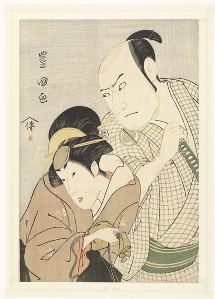 Editor: So, this woodblock print is by Utagawa Toyokuni I, made sometime between 1788 and 1808. It's a portrait of Ichikawa Komazo II, a Kabuki actor. The intricate detail of the robes, the way they’re patterned… What’s most striking to me is the flat perspective but incredibly ornate production of the textile itself. How do you see this work in terms of its materiality and the broader social context? Curator: I'm immediately drawn to the woodblock technique itself, how the material constraints shape the artistic outcome. We must consider the labor involved. These prints weren’t unique objects but products of a workshop system; many hands would contribute to the carving, inking, and printing. This materially impacts the "aura" of the piece. What does it mean for art to be produced and distributed like this at the time? Editor: It's almost like a pre-industrial form of mass production. So, does the subject matter—the actor—influence how we view the work through this lens? Curator: Absolutely! Kabuki, like woodblock prints, was a popular form of entertainment accessible to a wide audience. Think about the materials used for stage costumes versus everyday wear. The woodblock captures and recirculates that theatricality, making it available for consumption outside the theater. This reveals a great deal about the flow of capital and leisure. Editor: That connection between accessibility, performance, and material production gives me a completely different way of understanding Ukiyo-e. Curator: Exactly. Focusing on materials and production pushes us to ask different questions about value and artistic intention, broadening what we understand "art" to be at the time.
