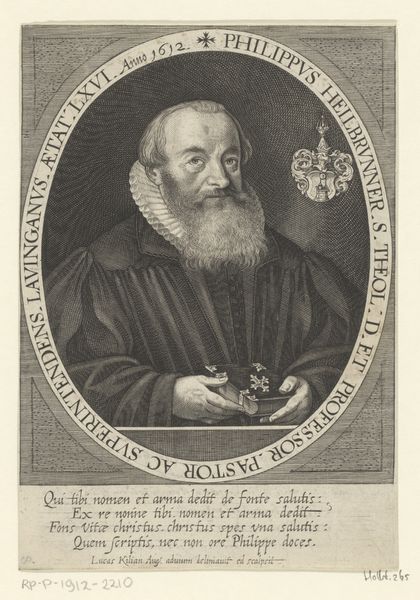 This is Lucas Kilian's "Portret van Antonio Albizzi," an engraving at the Rijksmuseum. Immediately, one notices the oval frame with the portrait of Antonio Albizzi, encircled by ornate details and inscriptions. The contrast between light and shadow accentuates the subject's features, drawing our attention to his gaze and dignified presence. The formal structure here speaks to a deeper semiotic system. Kilian uses the frame not merely as a border, but as a symbolic enclosure that elevates Albizzi. The detailed inscriptions and decorative motifs—elements like the cross, cherubs, and foliage—serve as signs of status, intellect, and cultural refinement. These visual components aren't just aesthetic; they're integral to constructing Albizzi's identity. Consider the texture achieved through engraving. The density of the lines creates a tactile quality, emphasizing the materiality of the print. This work reflects a broader cultural interest in portraiture as a means of conveying social and intellectual standing, a phenomenon still relevant in how we negotiate identity through images today.