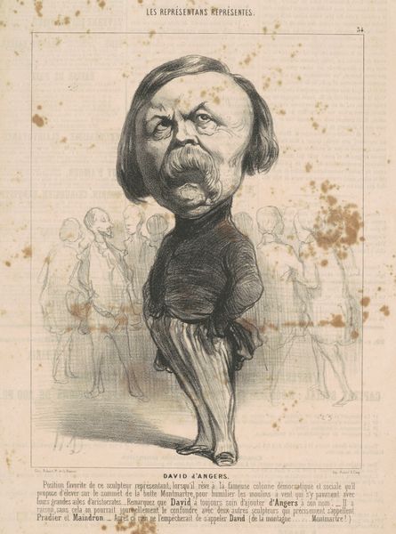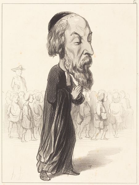 Honoré Daumier created this lithograph, titled "Jos. Ant. Ronjat", in 19th-century France, a period of immense social and political change. Daumier, known for his satirical eye, captures more than just a likeness; he critiques the figure’s role within the shifting social structures of the time. Ronjat's stern, almost defiant gaze, combined with the exaggerated features typical of caricature, invite us to question his position in society. Is he a figure of authority, or is Daumier poking fun at his self-importance? The crowd behind Ronjat adds another layer, suggesting a public forum or perhaps a gathering of dissent. The artwork's stark contrast and Daumier's skill in lithography heighten the emotional intensity. Ultimately, Daumier challenges us to reflect on the relationship between the individual and the collective, and how power dynamics are visually represented.