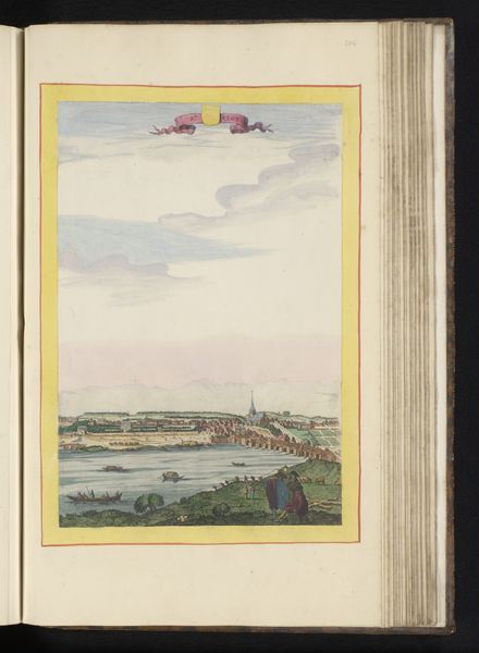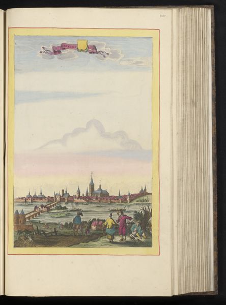 Curator: Let's consider this 1735 cityscape, titled "Gezicht op Warschau," believed to be made with a mixed media approach that marries printmaking with watercolor techniques. What catches your eye initially? Editor: I'm immediately drawn to the overall tone—a kind of melancholic serenity. The delicate washes of color give it an almost dreamlike quality, but there's also something stark in the detailed rendering of the city itself, especially juxtaposed with that mythological figure up above. Curator: Absolutely. The angel figure feels indicative of its historical context, when the symbolic representation of divine oversight was intertwined with civic identity. Angels are not only a key part of Christian iconography, but here it is likely that they carry ideological weight connected to the state. Editor: That angel is a pretty obvious display of power, wouldn’t you say? Almost propagandistic. But what really strikes me is how they managed to capture light with such basic materials. Looking closer, you can see the subtle ways the washes interact with the inked lines, almost mimicking atmospheric perspective. Curator: Exactly, this piece provides a valuable look into Baroque approaches, illustrating Warsaw in the 18th century, inviting us to reflect on power dynamics inherent in its visual representation. The landscape itself communicates ideals. Consider the elevated viewpoint—it signifies dominance, possession. It projects an intended visual narrative. Editor: That’s true. There's also the fact that it’s a print, made for wider circulation. The choice of a reproducible medium suggests a desire to disseminate that particular vision of Warsaw across a broad audience. The work provides some insight into the technologies used at the time. Curator: And it invites us to consider its consumption. Who had access to this image? What socioeconomic class? Editor: Thinking about the mixed-media aspect again, it makes me consider how those particular materials may or may not have been accessible and affordable in the period. Curator: True. This type of artifact allows us to contemplate intersectional histories that concern both those depicted within and those consuming it. Editor: Agreed. This piece certainly gets you thinking about power structures, materials and modes of consumption that go beyond the simple pretty picture.