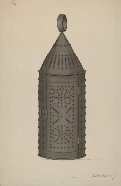 Curator: Welcome. Let’s explore Mildred Ford’s "Lantern," created around 1937 using pencil and metal. What strikes you initially? Editor: There's a certain somber quality, I think—almost starkness. It presents a lone object rendered in subtle greyscale, creating a quiet, contemplative mood. Curator: Agreed. Ford has focused meticulously on texture and form. Look at the details, how each perforation is painstakingly rendered to evoke light. The geometric pattern adds to the visual complexity and aesthetic appeal. Editor: While admiring the craftsmanship, I see something more. The lantern becomes symbolic. In times of darkness—political, economic, or social—the most marginalized need visibility. The care in illustrating it could be interpreted as advocating for unseen populations to be seen and accounted for. Curator: An intriguing lens through which to view it! What draws me in is the piece’s realism in portraying the metallic nature and the subtle light interplay, indicative of precision. Ford clearly understood volume, structure, and representation to elicit that sense of three-dimensionality. Editor: Beyond artistry, utilitarian objects used in marginalized spaces can speak volumes about societal hierarchies. Ford, in choosing this lantern, could be encouraging reflection upon forgotten places that remain lit, inhabited and persevering despite systemic inequities. Curator: A possibility, definitely. As a formal exercise, though, the work’s composition itself displays a brilliant command. Note how Ford directs the viewer's attention; a balanced but dynamic organization to provide overall visual harmony, really highlighting technical skills. Editor: Still, a lantern inherently relates to finding one's way and illuminating darkness, whether metaphorically or physically. The period context can reveal why Ford spotlighted it at a time rife with anxieties. Curator: Food for thought. On its own merit, Ford has truly created a wonderful image here. It is interesting how this close, detailed analysis reveals new ideas. Editor: Indeed! Objects are never just objects, they carry potential for us to interpret human presence, struggle, and determination through creative eyes.