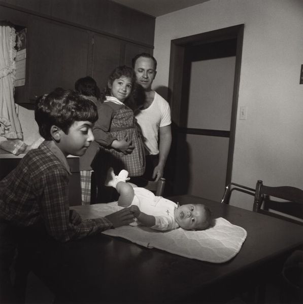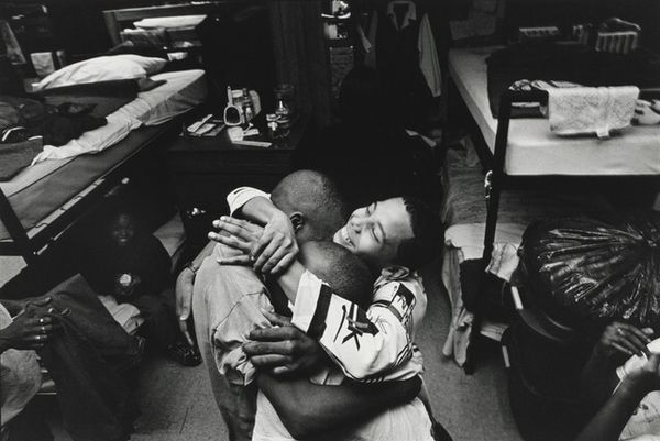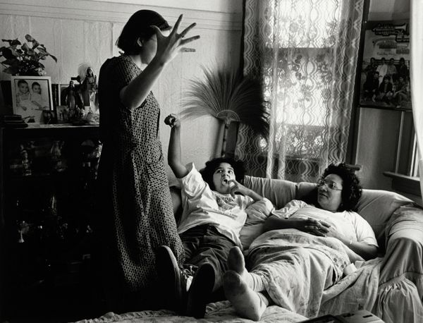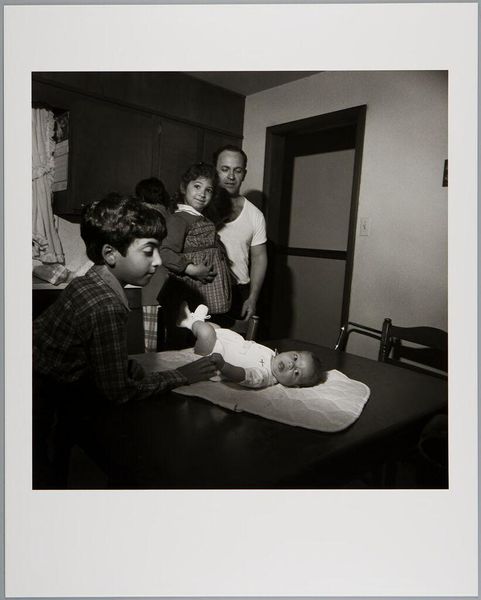 Curator: This gelatin-silver print, tentatively dated between 1989 and 1994, is titled "Slamming Alcohol" by Jim Goldberg. It's stark. The black and white emphasizes the grit, the almost desperate energy of the figures. Editor: It is definitely arresting, creating a feeling of claustrophobia and anxiety. You're drawn right into this intimate scene, and yet there's a barrier, a sense of not truly being able to access their lived experiences. Curator: The image foregrounds material vulnerability – track marks on arms, needles in hand. Consider the physical cost, the labor involved in maintaining addiction. It speaks volumes about societal neglect and the limited access these individuals have to healthcare and support structures. Goldberg's choices of medium and the print's accessibility also speak to art world assumptions of artistic 'value'. Editor: I think the photograph operates as a document of social reality, doesn’t it? Goldberg's work consistently seeks to expose the underbelly of society, challenging mainstream narratives. How does it impact viewers confronted with this image? Does it invite empathy, or perpetuate existing prejudices? Curator: Absolutely, there’s the ethics of representation here. He makes visible that which society prefers to ignore – consider the cultural perception of substance abuse and the demonization that follows; consider its role in perpetuating systems of oppression, denying addicts essential resources by denying them common humanity. Goldberg deliberately uses handwritten annotations to give the subject a level of authorship over the work. Editor: His choice to leave the image undated, as well, strikes me as a deliberate effort to contextualize it as both situated and timeless. In so doing, I would argue that the photograph is now a haunting historical record of a specific epidemic—as well as of wider, continuous, and systematic forces which determine a given person’s proximity to the conditions for addiction and its cycles. Curator: So the physical production, in this instance – a photographic print - is intimately linked to socio-political power relations and labor, isn't it? Editor: Undeniably, a harsh reflection on how societal structures and institutional failures shape individual lives. Curator: Agreed, and as viewers, we have to actively unpack the discomfort and implications it provokes.