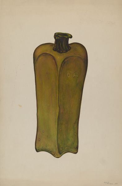 Editor: This is Cecily Edwards' "Clay Flower Jar," created around 1936, and it looks like it's rendered in watercolor. I'm immediately drawn to the almost playful, abstracted shapes. What do you see in this piece? Curator: It's a lovely piece. What immediately strikes me is how Edwards uses the simple image of a jar to tap into something primal. Think about the archetypal image of a vessel – in dreams, mythology, across cultures. What does a jar signify? Editor: Well, a container… a place to hold something? Maybe even, like, nurture it? Curator: Exactly! It’s linked to ideas of femininity, the womb, the source of life. The roundness of the jar reinforces that. And notice how she renders the jar imperfectly. It’s chipped and worn. What do these imperfections suggest? Editor: Maybe it's a contrast. The jar, symbolizing something perfect like potential life, is actually flawed. It's… human? Curator: Precisely! Edwards reminds us that even symbols of perfection bear the marks of time, the reality of existence. And think of the green, a life-giving color, dominating the jar’s upper half – suggesting growth, abundance. Editor: It’s interesting how something so ordinary can be layered with so much meaning. I wouldn't have looked at it that way at first glance. Curator: Visual language is potent because of these layers. By painting a ‘simple’ jar, Edwards is able to transmit an array of ideas, creating a deep and accessible reflection. We have to unpack this visual code to appreciate her cultural contribution. Editor: Thanks for unveiling it! I am walking away from this conversation seeing both an actual painting and a historical statement.