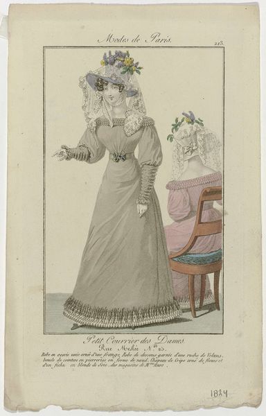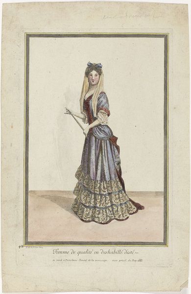 This print, "Nobilis Gallica ornatta," likely from the 1600s, depicts a French noblewoman through the meticulous techniques of engraving and etching. The image begins with a metal plate, meticulously incised to hold ink. The fine lines, defining the woman's elaborate gown and distinctive ruff, demonstrate the engraver's skill. Etching, using acid to bite into the metal, adds tonal depth and texture. The print is then hand-colored, bringing life to the fabrics and ornamentation. The social context of the artwork is very important, as the print medium allowed for wider distribution of fashion and aristocratic identity. The labor involved extends beyond the artist to the artisans producing paper, inks, and pigments, and emphasizes the social and economic structures of the time. It challenges our understanding of art, prompting us to consider the skilled trades and cultural values embedded in its creation.