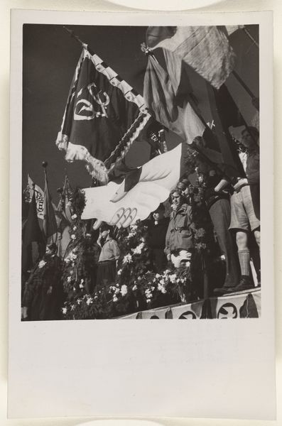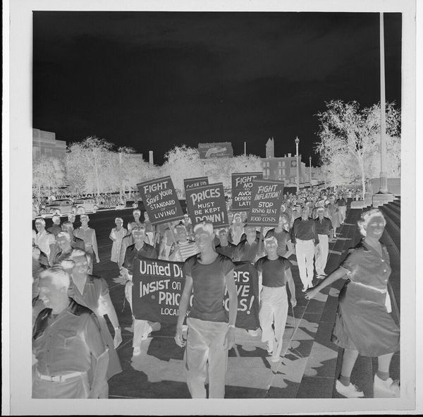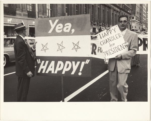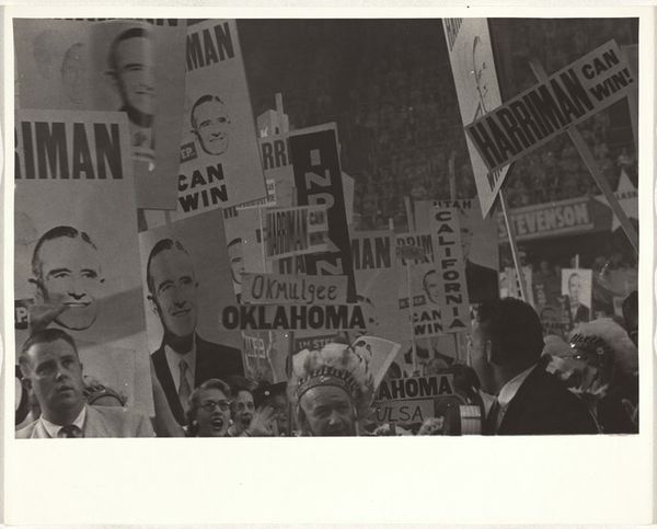 Robert Frank made this gelatin silver print, “Delegates, convention hall--Chicago,” using readily available materials and processes of photography. Consider the material properties of photography itself: light-sensitive chemicals, a lens, and the alchemic process of development. The grainy texture and high contrast, both technical aspects, also feel like a conscious choice here. This aesthetic distances the image from the slick, highly produced images of commercial advertising of the period. Frank's method involved acute observation and a rapid, intuitive approach, akin to street photography. This suited his project, which sought to reveal the everyday realities of American life beyond the idealized images presented by mainstream media. The signs the delegates hold up, boldly declaring "CAN WIN" are also products of industrial manufacture, churned out in volume. By emphasizing process, we can see how the choices of materials and methods are integral to the artwork's meaning. Frank's photography challenges traditional hierarchies, positioning the everyday, the gritty, and the process-oriented as worthy subjects of artistic attention.