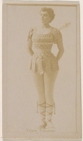 This is a promotional card for Sweet Caporal Cigarettes by Kinney Brothers, featuring Trixie Triganza, an actress, around the turn of the century. Triganza’s costume, a stylized tunic and laced footwear, evokes classical antiquity. Observe the zig-zag pattern adorning her garment: this motif, echoing the meander of ancient Greek art, speaks to the complex interplay between surface and depth. This symbol has migrated and evolved through various cultures, initially representing the twisting course of a river. As the river gives life and sustenance, so the meander evokes the cyclical rhythms of existence, the labyrinthine dance between order and chaos. The image, like a dream, draws upon deep, subconscious associations, reminding us that images are never truly new but rather a re-emergence of what has been. Like the ouroboros, the snake eating its own tail, these symbols reappear, reinvented through history, eternally feeding our cultural imagination.