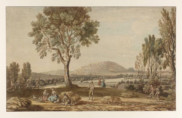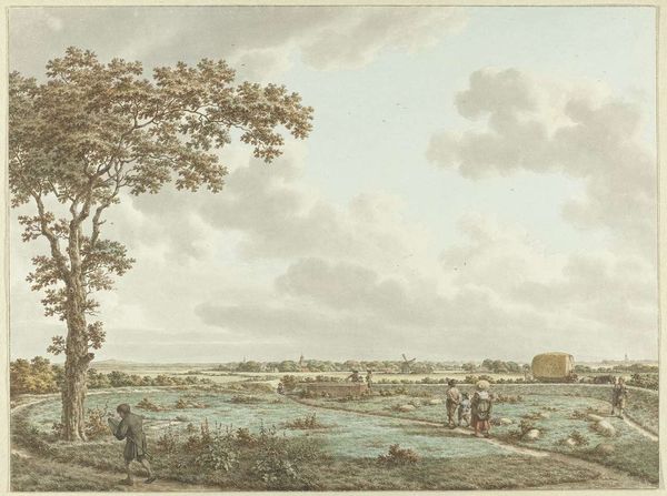 Editor: Here we have Jacob Cats' "Zomer, middag en lucht," or "Summer, Noon, and Sky" created around 1797. It’s a watercolor on paper. The scene gives me a sense of a tranquil, everyday summer in the Dutch countryside, and what strikes me is the sheer volume of the sky. What stands out to you? Curator: Note how Cats employs the horizon line not as a mere separator, but as a crucial structural element. The clouds are not just representations of meteorological phenomena, they command pictorial space and influence how all other formal components, like colour, tonal values, and structural masses contribute to the artwork's spatial and thematic integrity. Consider the semiotics of sky within this context; what might the elevated horizon suggest about human presence versus the immensity of the natural world? Editor: So, you're saying that the placement and treatment of the sky isn't just realistic, but strategically important to the overall meaning and structure? Curator: Precisely. It invites a dialogue between earthly constraint and ethereal boundlessness. Let us not overlook, either, Cats' handling of tonal variation across the landscape. The shift from the vibrant foreground colours to the atmospheric fading in the distance—does it evoke particular ideas or emotional states in you? Editor: I guess the gradations definitely create depth, almost an invitation into the painting. The artist manipulates tone and aerial perspective, but to emphasize depth, like an endless pull? Curator: Exactly. These aren't just representational skills at work, but choices to guide the viewer’s perceptual and intellectual engagement with the art piece. And the light, observe its behavior, how does it impact your experience of form and depth? Editor: It seems to subtly wash out the colours in the distance making the sky seem lighter than what I'd expect, this directs my eyes more easily across the landscape. Curator: An excellent observation! The composition and colouring guides the viewer’s eye, using these as structural components. Editor: It’s fascinating to think about these decisions beyond just representing the scene itself. Thanks for helping me consider all of these aspects!