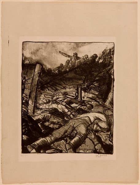 Editor: Here we have Edouard Manet’s "Civil War." The sharp contrasts in tone and the rough marks give it a chaotic feel. What do you see in the composition of this drawing? Curator: The work employs a stark juxtaposition of light and shadow to emphasize the brutality of the scene. Note how the artist uses line to create a sense of depth and disorder, reflecting the violence. Editor: So, it's about how the elements are arranged, not necessarily the historical context? Curator: Precisely. The power lies in the formal relationships: the weight of the dark figure against the fragmented background, the lines of force that pull our eye across the carnage. It is in these tensions that Manet achieves meaning. Editor: I see, focusing on how the visual elements themselves create the impact. Thank you. Curator: Indeed. It is a sobering reminder of how form can convey the most profound content.