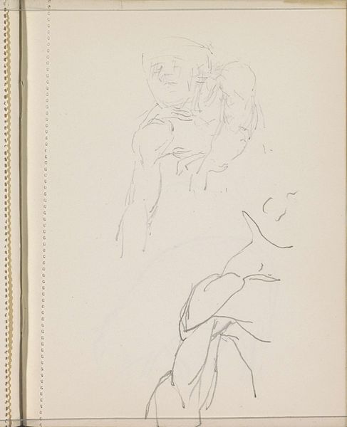 Editor: So, this is "Man en vrouw tegenover elkaar," or "Man and Woman Facing Each Other," a pencil drawing on paper by Isaac Israels, dating from around 1915 to 1925. The sketchiness gives it a feeling of transience, like we’re seeing a fleeting moment. What strikes you most about it? Curator: What’s fascinating here is how Israels, known for his Impressionistic style, engages with the representation of modern relationships and social dynamics of the time. We need to consider how societal expectations and gender roles impacted his artistic choices. What kind of relationship dynamic do you perceive in this drawing? Editor: I’m not entirely sure. It seems informal and perhaps unbalanced, given their placement on the page and the woman's facial expression being so much more defined. Could it be reflecting something about the changing roles of men and women at that time? Curator: Precisely! The era was marked by significant social shifts, particularly in the roles and expectations of women. Israels’ sketch might subtly depict the evolving dynamics, perhaps hinting at the woman's emerging visibility in public life while still retaining some ambiguity, which opens the door to various interpretations influenced by the viewer’s own background. What do you think about the incompleteness of the sketch and how that affects its social message? Editor: That's interesting! The sketch-like quality does make it feel unfinished. It makes you wonder if he intended to leave it open to interpretation. Thank you, that definitely shed light on how much the social context informs our view of the artwork. Curator: Yes, it really brings context into focus. It makes you appreciate art and art history more.