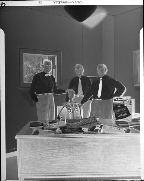 Editor: This photograph, titled "Untitled (men having business meeting around table)" by Peter James Studio, captures a formal meeting setting. The stark, almost ghostly quality of the image gives it an unsettling mood. What kind of cultural memory does this image evoke for you? Curator: The portraits in the background suggest a lineage, a tradition of power or achievement. Notice the contrast between these idealized figures and the active, perhaps tense, meeting in the foreground. What stories of aspiration and anxiety might this juxtaposition tell? Editor: So the image connects past authority with present-day ambition? Curator: Precisely. The meeting, a ritual in itself, becomes a stage where individuals negotiate their place within this inherited narrative. The photograph reminds us that even in business, symbols and power dynamics are always at play. Editor: That makes me see the image in a completely different light. Thanks!