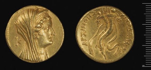 Curator: At the Harvard Art Museums, we have a stunning example of an Oktodrachm (mnaieion) of Ptolemy II. Editor: The first impression is undeniably striking, its scale hinting at its significance and value. Curator: Precisely. The high relief portraiture is of Ptolemy II Philadelphos himself, rendered in shining gold. The formal composition emphasizes power and divine right. Editor: It's interesting to consider how rulers use images, like on coinage, to broadcast legitimacy. The coin becomes propaganda, circulating political messages. Curator: The execution suggests a sophisticated understanding of form and the symbolic weight of materiality. Gold emphasizes value, power, and immortality. Editor: Absolutely, and the use of portraiture creates a visual vocabulary of leadership and authority. It makes me reflect on the political life of images. Curator: Indeed, and examining the artifact's inherent artistic qualities highlights the lasting impact of the Ptolemaic aesthetic. Editor: It's clear that this coin is a powerful testament to cultural expression and its role in society.