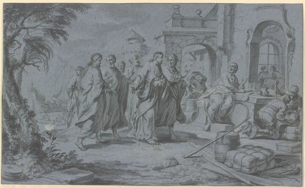 Editor: This etching by Wenceslaus Hollar, titled "The Daughters of Aglaura," created between 1641 and 1651, has a captivating circular composition. The women processing through the landscape evoke a sense of classical antiquity. What's your perspective on this work? Curator: Well, considering the etching technique itself – the physical act of incising lines into a metal plate to reproduce an image – it’s impossible to separate the image from its means of production. Hollar’s skilled labor created multiple impressions; How does that impact our reading of it as either fine art or commodity? Does the reproducible nature challenge traditional boundaries of art making, creating multiple originals in essence? Editor: That's a fascinating point. It makes me consider the economics of art in the 17th century – were these prints more accessible to a wider audience because of the production method? Curator: Exactly! Consider the paper, ink, and the printing press itself. The image’s distribution relied on material resources and social systems, influencing its reach and meaning. Who controlled access to these materials and who could afford them? The very act of creating multiple copies democratizes the image but relies on complex, class-defined material realities. Do you think Hollar himself was considering the social impact? Editor: I suppose it's difficult to say definitively. It's likely he understood the commercial aspects, given printmaking’s role as a means of income. The details in the landscape and the figures suggest an attention to detail beyond mere function. Curator: Perhaps. Ultimately, acknowledging the social and material context gives us a much deeper understanding than purely aesthetic appreciation, right? Editor: Absolutely. I've never considered that before. Now, I'm more intrigued by what these figures could mean within their time. Curator: Precisely! Each work's existence can unveil underlying currents we hadn't previously considered.