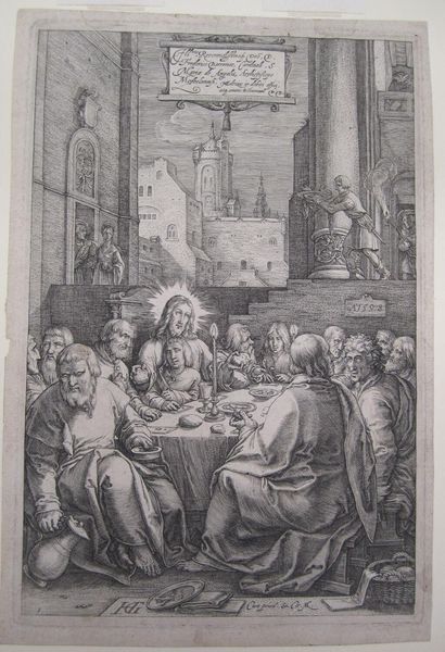 Curator: My first impression is that the mood seems strangely agitated. Everyone's gesturing and gesticulating; there's hardly any stillness at this table. Editor: Indeed. This print, entitled "Laatste Avondmaal", or "Last Supper" in English, dates from between 1534 and 1590. It’s currently held here at the Rijksmuseum and is attributed to Chrispijn van den Broeck. As a medium, it’s an etching, offering fascinating insight into printmaking techniques of the Renaissance. Curator: Van den Broeck captured the moment where Christ reveals that one of his apostles will betray him. Betrayal! We know how that story ends, and it carries so much emotional baggage for us today. I mean, look at Judas—is that him recoiling near the center, or am I projecting? Editor: It’s tempting to see the story enacted so vividly. But let’s also look at the process, the labor invested in this print. Consider the different lines used to create the values, the hatching and cross-hatching that would have been painstaking work, to give us these tonal changes. These materials allow him to make unlimited copies that can spread. The very making of this work allowed the narrative to reach wider audiences, beyond those who could read or even attend church. Curator: That's an interesting perspective. I find it hard to ignore the composition, the way all those gazes converge upon Christ. Even the architectural backdrop, the heavy drapery—it all emphasizes the solemnity, even the doom of the moment. There’s that shared chalice, foreshadowing sacrifice. The halo emphasizes divinity. Editor: You see symbolic doom, and I see labor. How many impressions could have been made from this single plate? Where would these prints have been sold and who could afford them? The symbolism functions, yes, but also works as a piece of consumable material circulating within a specific economy of faith. Curator: I guess for me it goes deeper. That simple loaf of bread… the weight of history behind those symbols, it's truly captivating. The gestures and body language offer a rich vocabulary of human response to divine knowledge. Editor: Seeing Van den Broeck's "Last Supper" through both our perspectives shows that artistic interpretation itself is an ongoing process, shaped by what we choose to focus on. Curator: Yes, focusing on that rich, interwoven story that can emerge.