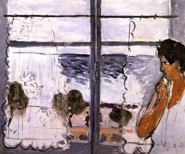 Curator: Welcome. Today, we’re observing Henri Matisse's "Blue Interior with Two Girls," painted in 1947. Matisse, of course, played a critical role in defining early modernism. This work is oil on canvas. Editor: My first thought? Calm. Even with those slightly frenetic lines buzzing around the window, there’s a real sense of peace. Curator: It's fascinating how Matisse constructs a domestic scene—two girls in an interior. The bright hues might seem cheerful on the surface, but if you consider the social context in postwar Europe, there's a tension beneath that seemingly optimistic veneer. Editor: Yes, the colors shout, but the composition whispers. Those broad strokes aren't just haphazard. I see a kind of gentle rebellion against gloom using a flattened space. It is like he decided to fill every corner with light in this small interior space. Curator: Precisely. This flat space serves to undermine traditional perspectival painting, moving toward a distinctly modern aesthetic. How the domestic interior functions as a political and cultural space really interests me. Editor: Looking closer, I love the naive details—the curtain lines feel less about realistic rendering and more about creating visual rhythm, adding some whimsical humor! And it allows for our eye to constantly dance within the confines of the frame. Curator: I find the flowers intriguing too. Flowers often have strong symbolic meanings; consider that while you let your eye wander across this piece. And of course, this sort of symbolic rendering, a step away from naturalism, was an important strategy to convey meanings beyond mere documentation. Editor: Agreed! But beyond any literal meaning, the gesture and palette create a sort of emotional space. The color choices really evoke some hope despite everything. To be an artist creating works that embrace vibrancy and beauty, to create that art in 1947 – I am inspired. Curator: It underscores how his innovative formalism cannot be extracted from his social context. Editor: Absolutely, which makes this viewing even more worthwhile. Curator: It provides great food for thought!