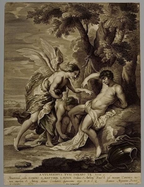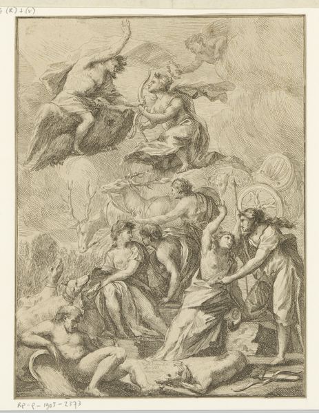 This engraving, ‘Venus, Apollo, en andere goden en godinnen op de wolken’ was created by Reinier Vinkeles. The careful placement of each god and goddess suggests a sophisticated understanding of form and thematic structure. The artist uses the technique of chiaroscuro—a stark contrast between light and shadow—to direct our eyes and emphasize the texture of the clouds. These clouds are rendered with such detail that they seem almost palpable, inviting us into the ethereal realm of the gods. There’s a deliberate interplay of lines and curves that softens the otherwise rigid composition. The softness and roundness of the figures contrast with the medium’s linear precision. The composition defies classical expectations, pushing beyond traditional forms. This engraving invites us to consider how such technical and formal elements function to create meaning, offering a space for ongoing interpretation.